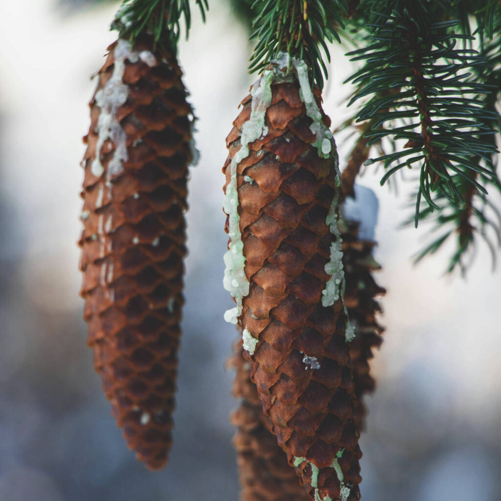 In the midst of the cold, dark and somewhat dormant times of winter, there is joy and creativity to be found in the beautiful strong-standing evergreen trees. They give colour and life to the otherwise dull and grey nature we’re experiencing in the north at this time of year. Their scent enlivens the spirit from winter hibernation and helps us find peace, motivation and strength in the darker months. They are a great winter medicine, an interesting wild food for enthusiastic winter foragers, and good companions for the forest lover.